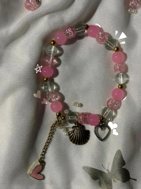 Design: Soft Pastel Beads (Pink, Clear & Frosted) with Gold Spacers + Dangling Charms (Shell 🐚, Heart 💗, Chain Accent)